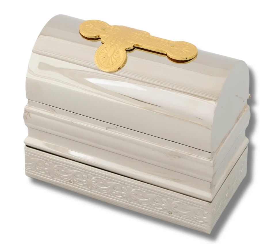 Small baptismal kit with nickel finish. Length: 4″ Width: 2″ Height: 3″
