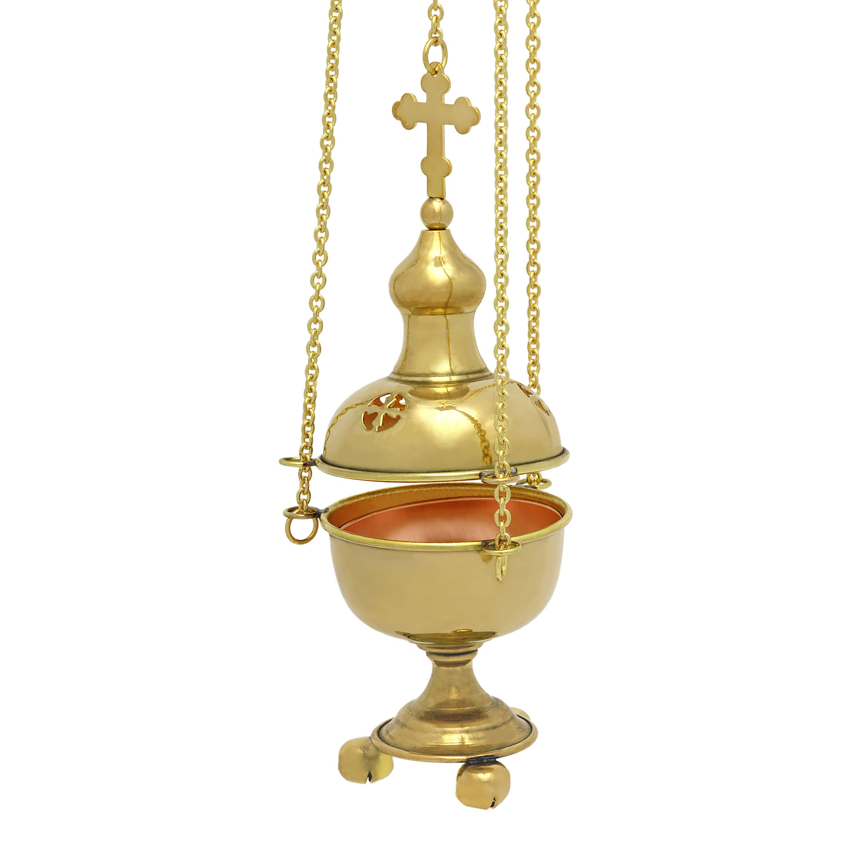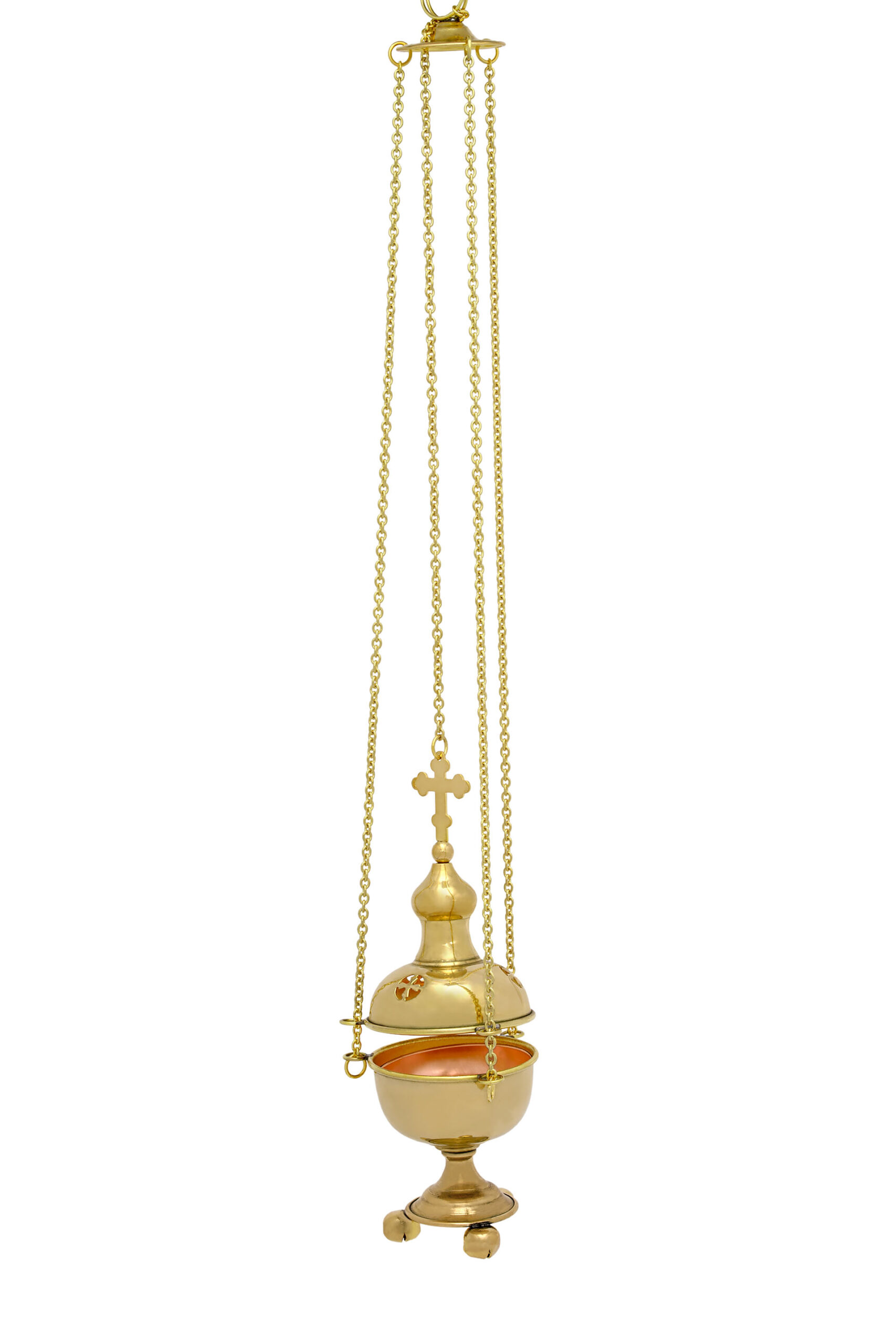 Censer imported from Russia. Gold plating is of high quality with deep finish, not a bright yellow, but deep with reddish undertones. Measures: 4″ wide x 4″ wide x 26″ tall. Weight: 15oz