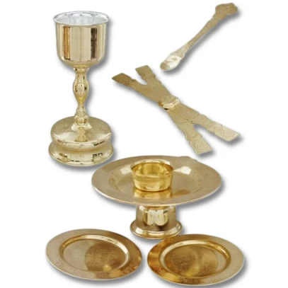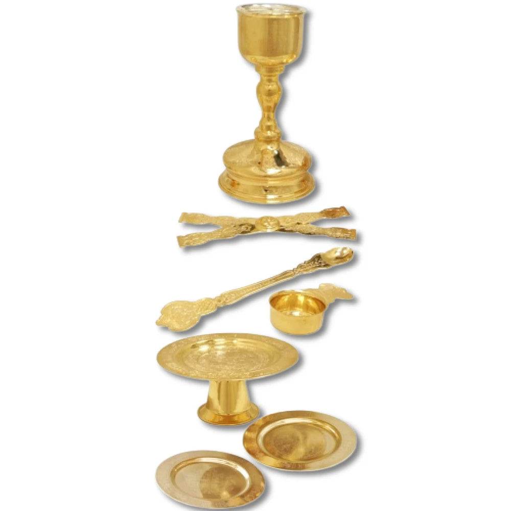 Imported from Russia. Chalice made from high finish stainless steel with gold plating. 0.5L (approx. 1/2 quart) standard size. Includes the following all in corresponding 0.5L sizes: 1 chalice, 1 discos, 1 star, 1 communion spoon, 1 zapivka/zeon cup, and 2 cutting plates (set).