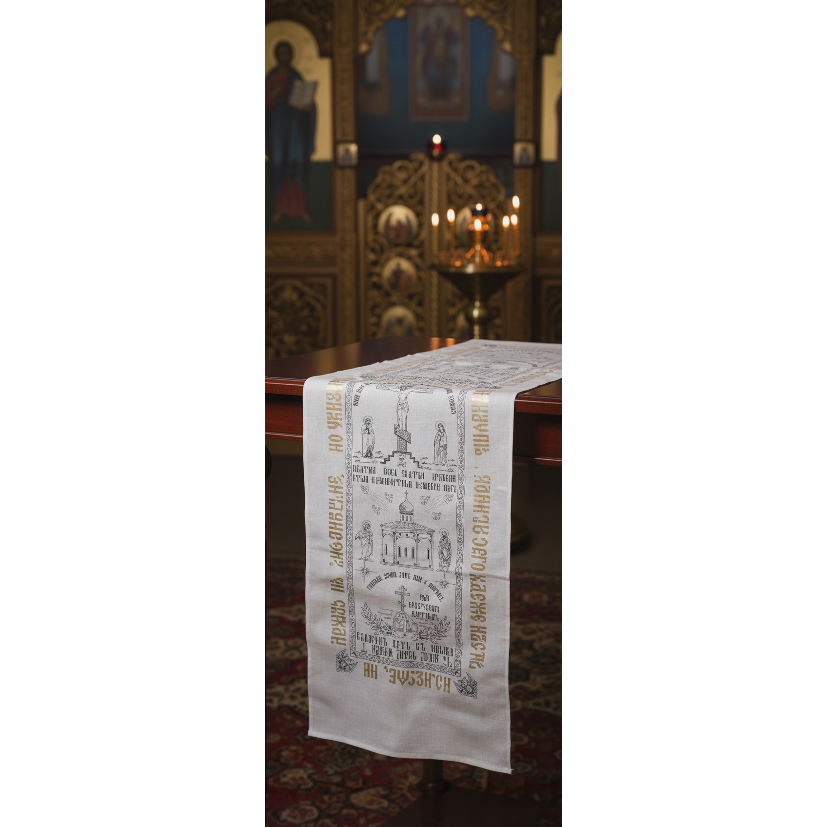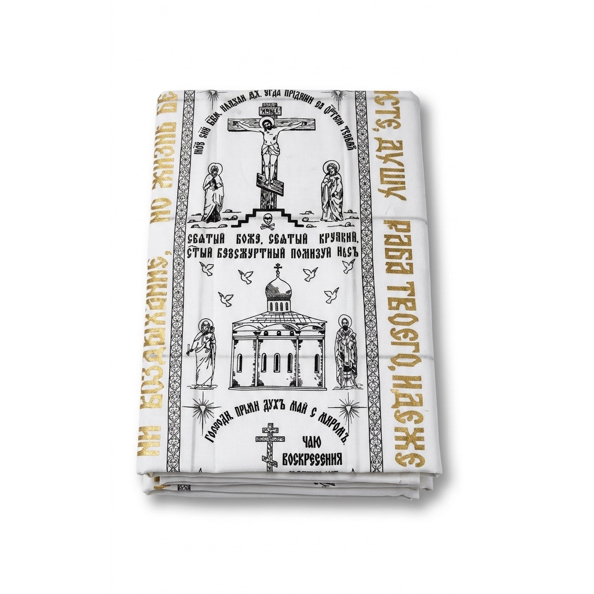 The traditional Church Slavonic prayers and iconography are rendered in luminous gold-leaf lettering, providing a beautiful contrast against the white material. A centerpiece of exceptional quality, this shroud honors the tradition of the Church with grace and solemnity.