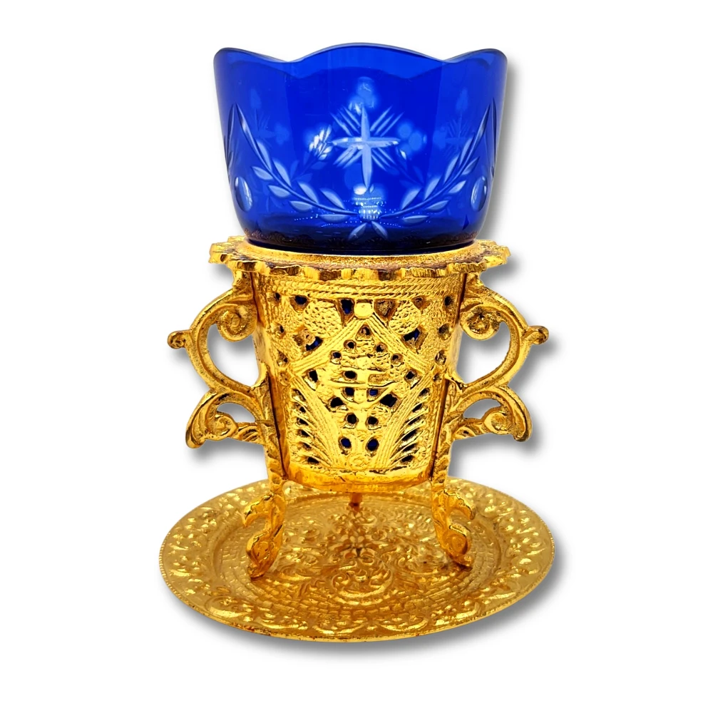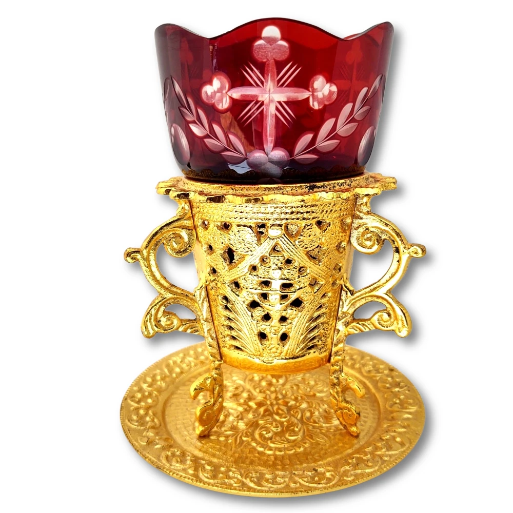 Gorgeous hand crafted Vigil / Lampada stand. Casted from quality metal brass and gold plated. Offered with hand blown Romanian Glass Cup.