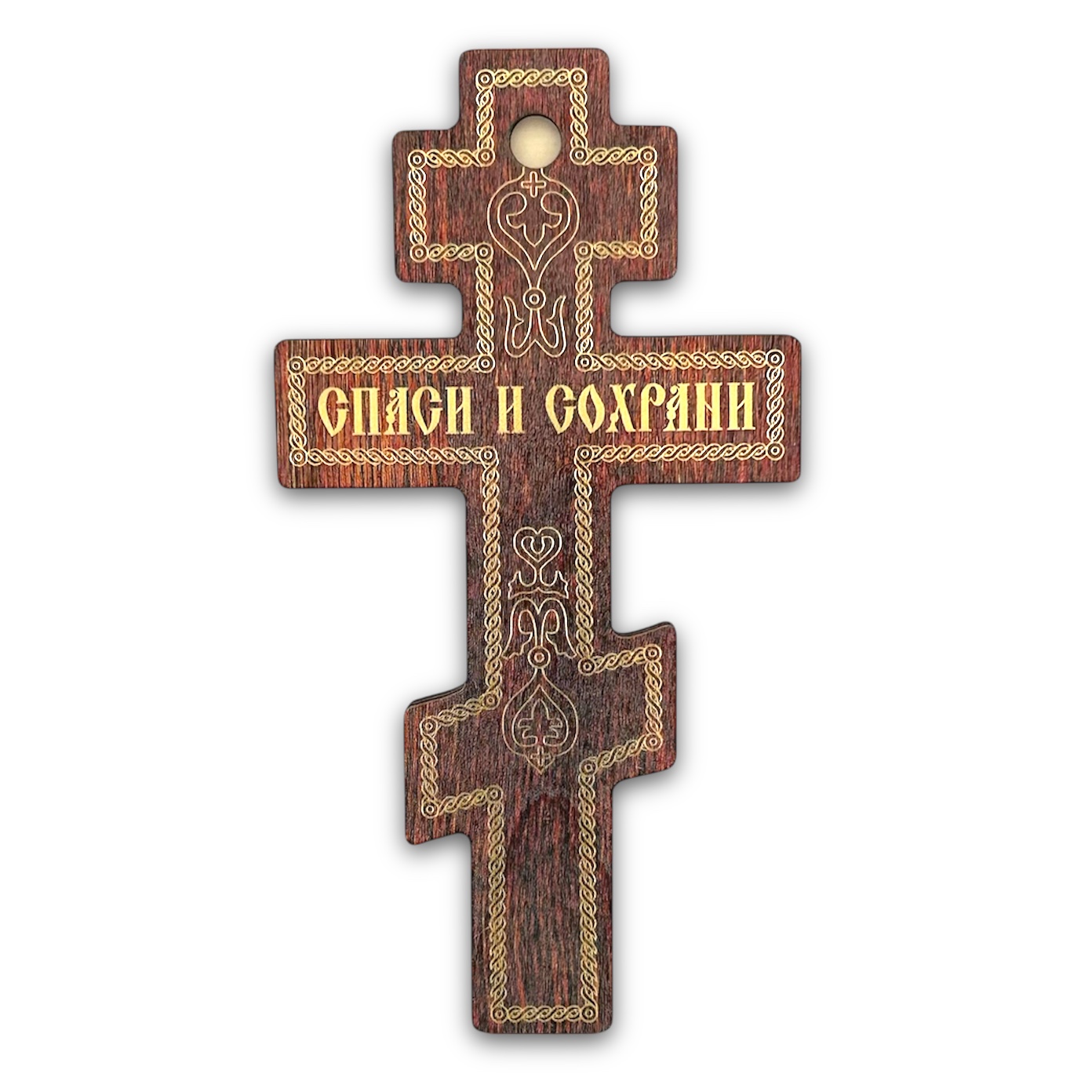 Laminated cross mounted on thin wood.