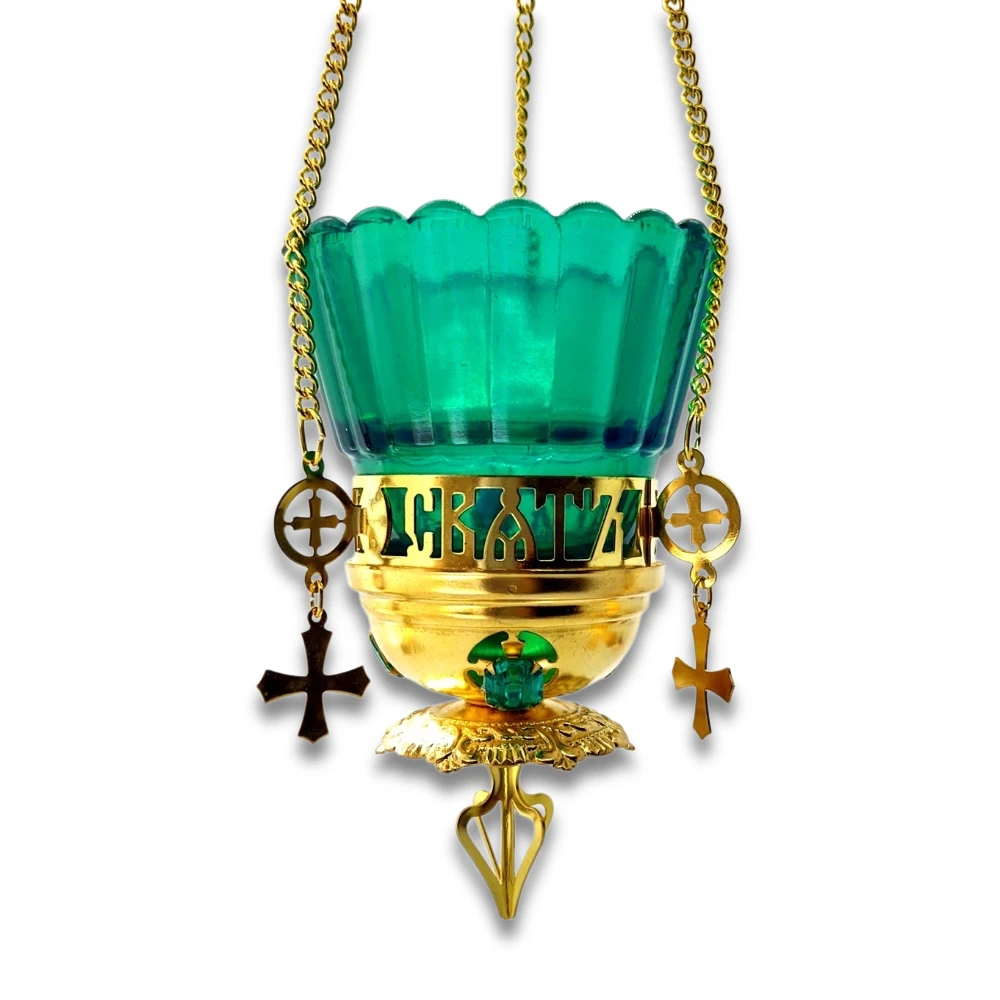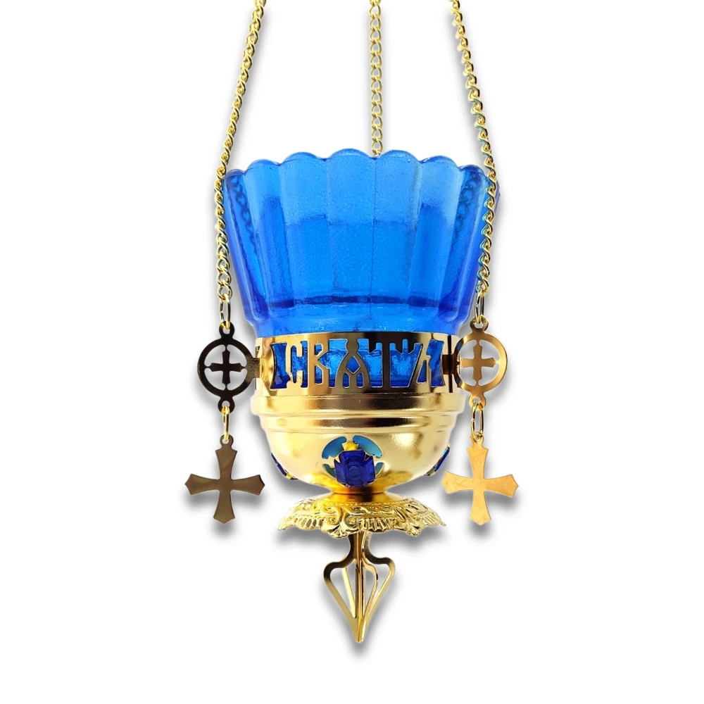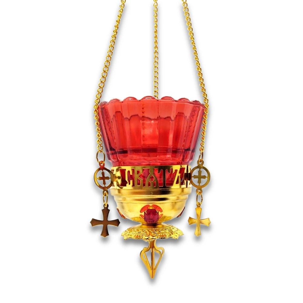 Finish: Polished brass Vigil Lamp size: 3.5in wide x 5.5in tall Total Length with chain: 26in Glass width: 3.25in