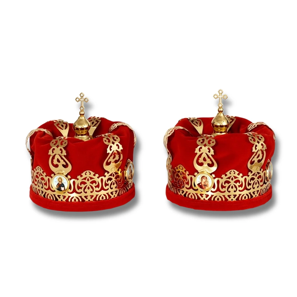 Wedding crowns, Russian style, imported from Russia, gold plated. 1 pair: 9.45 x 8.66″.