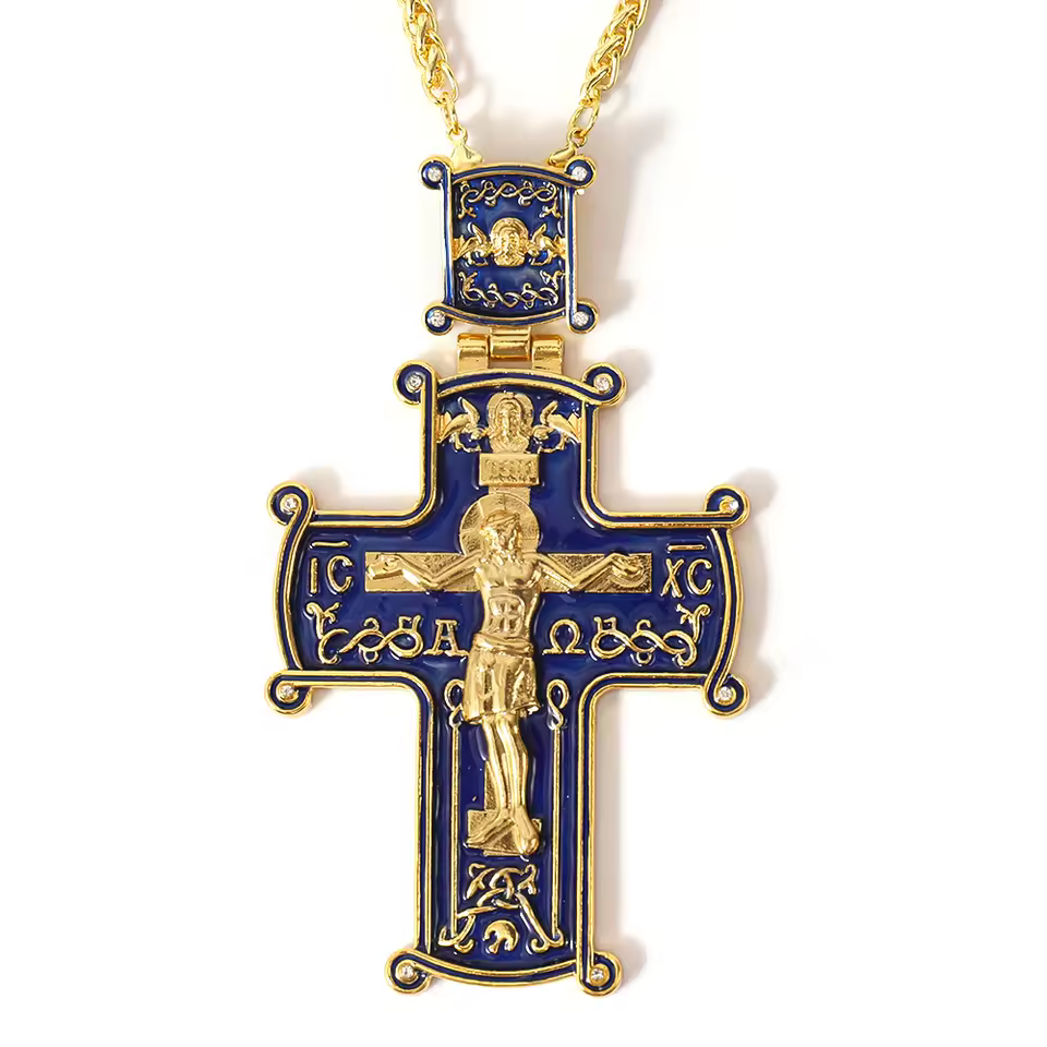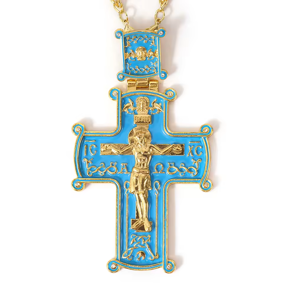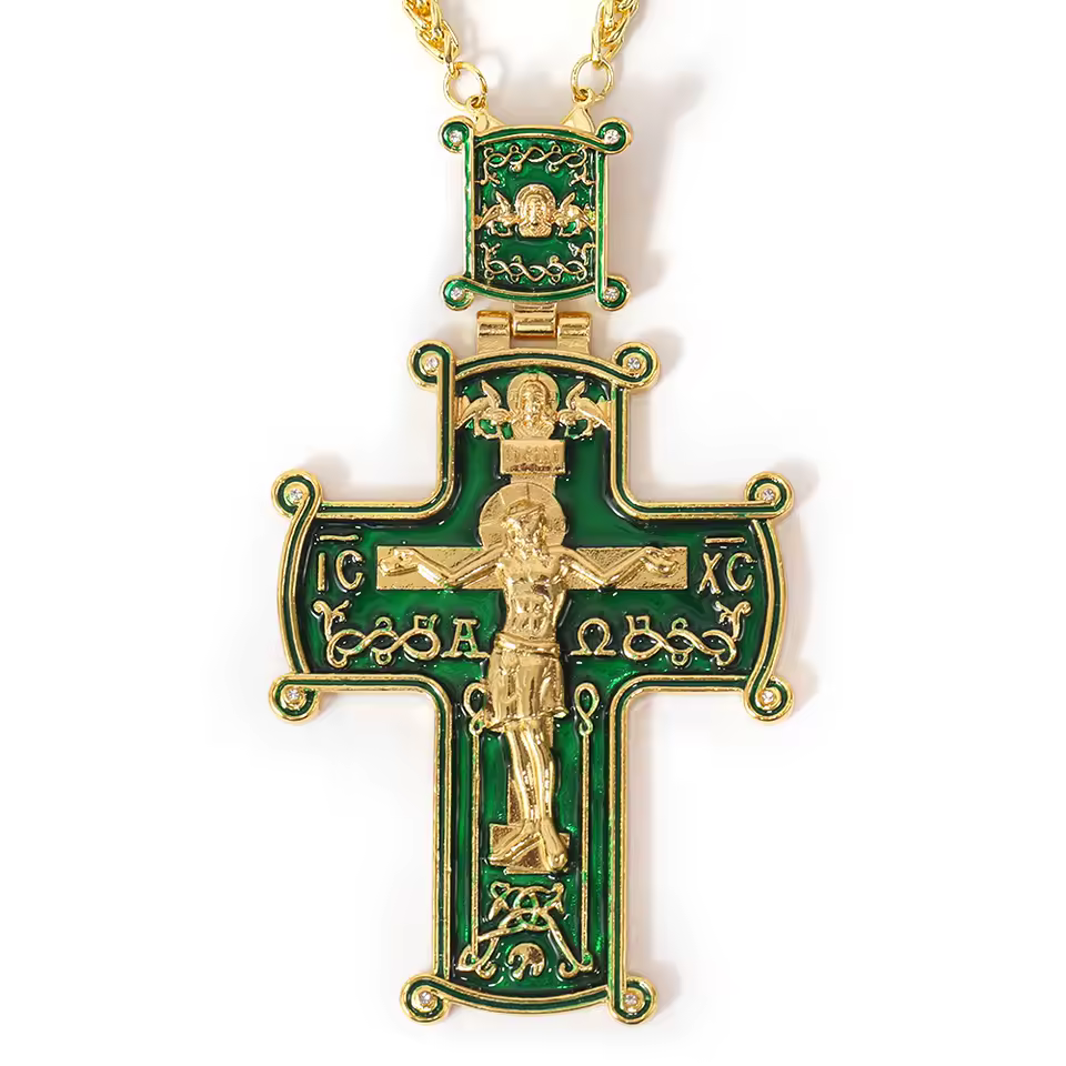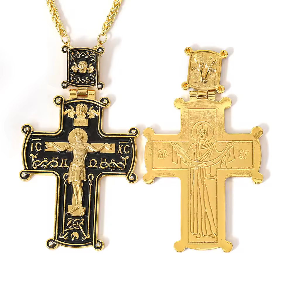 A pectoral cross featuring the Crucifixion of Christ on it face. The reverse bears the Protection of the Most Holy Theotokos, depicting her outstretched veil as a sign of comfort and intercession. This cross unites the image of Christ with the loving protection of His Holy Mother