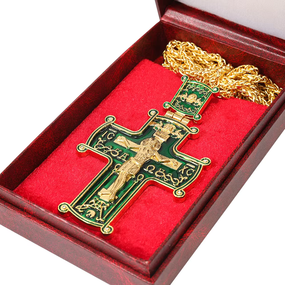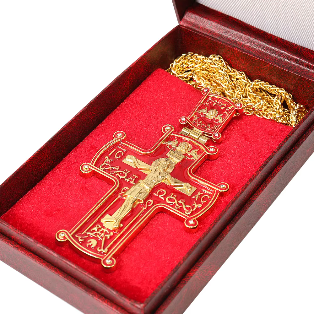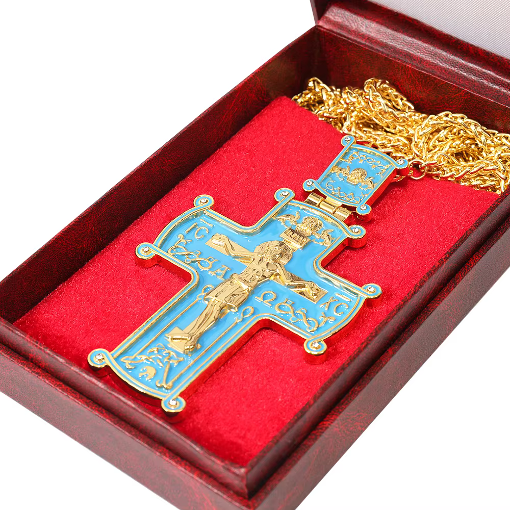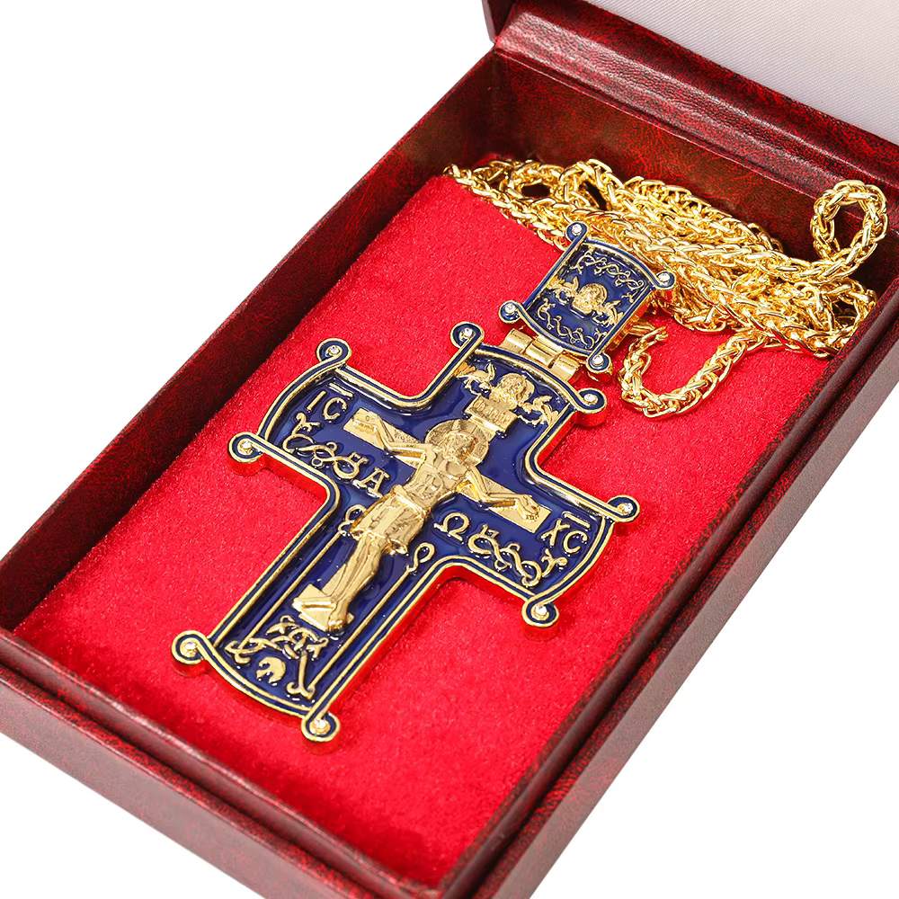 A pectoral cross featuring the Crucifixion of Christ on it face. The reverse bears the Protection of the Most Holy Theotokos, depicting her outstretched veil as a sign of comfort and intercession. This cross unites the image of Christ with the loving protection of His Holy Mother